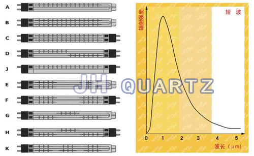 短波石英燈采用帶支架圈的鎢絲做輻射體,封閉在石英玻殼中,其波長(zhǎng)范圍為 0.8-1.8 微米,在 1.2 微米時(shí)達(dá)到峰值。